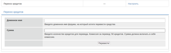 Arakhen 19 августа 2022 в 15:33 посмотреть полностью | На этот раз крупной подборки апдейтов не будет, поскольку в этом полугодии было больше неотложных восстановительных работ из-за неполадок, вызванных происходящим. Принесу небольшую, но приятную. :flag:  ❖ Реализована возможность переноса кредитов с одного форума на другой. Для переноса необходимо зайти в "Администрирование" > "Платные услуги" и выбрать настройку функции "Перенос кредитов". Далее внести доменное имя того форума, куда планируется перенос, и сумму. Сумма должна включать в себя комиссию (50 кредитов). Пользоваться функцией может только главный администратор форума. Для переноса учитываются все домены форума (как "родной", так и прикрепленные).